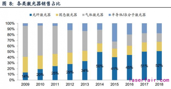 光纖激光器是目前的主流激光器。按照增益介質(zhì)的不同,激光器主要可以分為液體、 氣體、固體激光器,其中YAG固體激光器、CO2激光器先后占據(jù)主流。從90年代后 期開(kāi)始,光纖激光器逐漸成為激光產(chǎn)業(yè)研究和應(yīng)用的主流,在激光器市場(chǎng)銷(xiāo)售占比 從2009年的14%增長(zhǎng)到2018年的52%。