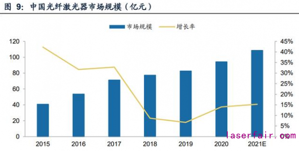 光纖激光器市場(chǎng)規(guī)模持續(xù)提升,中國(guó)成為全球最大市場(chǎng)。場(chǎng)銷(xiāo)售收入已經(jīng)達(dá)到全球的45%,是全球最大的銷(xiāo)售市場(chǎng)。2020年國(guó)內(nèi)光纖器市場(chǎng) 規(guī)模達(dá)94.2億元,同比增長(zhǎng)14%,中國(guó)市場(chǎng)進(jìn)一步擴(kuò)張。受到匯率波動(dòng)、貿(mào)易戰(zhàn)、 國(guó)產(chǎn)化替代和價(jià)格戰(zhàn)等因素影響,2019年IPG在中國(guó)這一最大市場(chǎng)上的營(yíng)收同比下 降了21.9%,2020年也僅同比增長(zhǎng)2.11%,而國(guó)產(chǎn)6kW以上的激光器開(kāi)始逐步參與 競(jìng)爭(zhēng)。巨大的國(guó)內(nèi)市場(chǎng)和海外企業(yè)優(yōu)勢(shì)的削弱,為國(guó)產(chǎn)替代創(chuàng)造機(jī)遇。