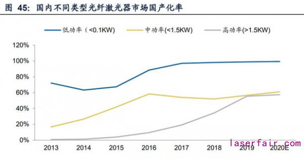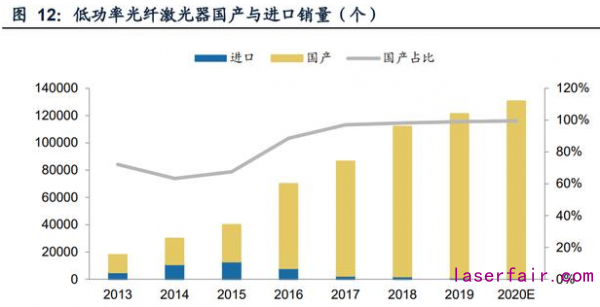 低功率光纖激光器基本實(shí)現(xiàn)國(guó)產(chǎn)替代,競(jìng)爭(zhēng)轉(zhuǎn)向中高功率產(chǎn)品段。光纖激光器按照 激光燈工作模式,主要分為脈沖光纖激光器和連續(xù)光纖激光器,按輸出激光功率大 小可分為低、中、高三檔。在低功率光纖激光器上,近年來(lái)國(guó)產(chǎn)品牌出貨迅猛,出 貨量從2013年的1.3萬(wàn)臺(tái)上升至2019年的12萬(wàn)臺(tái),CAGR超過(guò)45%。市占率在2019 年達(dá)到99%,基本完成國(guó)產(chǎn)替代。