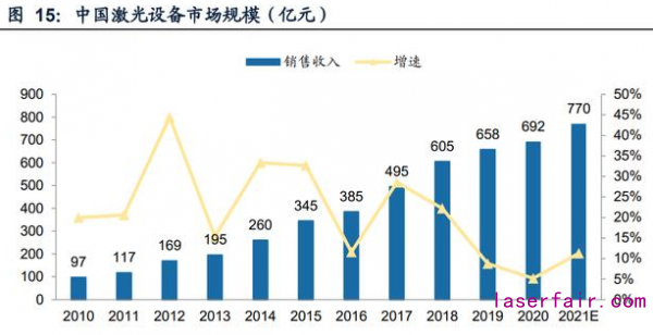 激光加工對(duì)傳統(tǒng)加工的加速替代,使得激光設(shè)備市場(chǎng)規(guī)模迅速擴(kuò)大。激光加工作為 能夠在多領(lǐng)域替代傳統(tǒng)機(jī)械加工的新型加工技術(shù),在加工材料的材質(zhì)、形狀、尺寸 和加工環(huán)境等方面有著較大的自由度,能夠較好地解決不同材料的加工、成型和精 煉等技術(shù)問(wèn)題,目前已經(jīng)在汽車(chē)、電子、航空航天、機(jī)械、冶金、鐵路、船舶等領(lǐng) 域越來(lái)越多地取代傳統(tǒng)制造技術(shù)。這一替代效應(yīng)使得2010-2018年我國(guó)激光設(shè)備市 場(chǎng)經(jīng)歷了持續(xù)的高速增長(zhǎng),增速長(zhǎng)期位于20%以上的高位,總銷(xiāo)售收入在2018年達(dá) 到605億元。2019年增速略有放緩,2020年達(dá)到692億元。