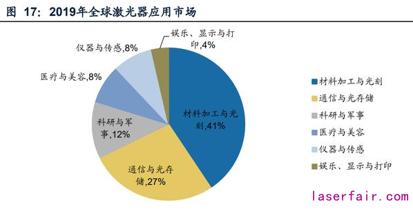 工業(yè)應(yīng)用是激光加工的主要方向。就全球市場(chǎng)而言,2019年全球激光器最大應(yīng)用市 場(chǎng)為激光材料加工與光刻市場(chǎng),銷(xiāo)售收入達(dá)60.3億美元,占激光器總銷(xiāo)售收入的 40.6%,其次是通信和光存儲(chǔ)市場(chǎng),銷(xiāo)售額39.8億美元,占比27.1%。隨后分別是科研與軍事、醫(yī)療與美容等市場(chǎng)。就中國(guó)市場(chǎng)而言,2020年我國(guó)工業(yè)領(lǐng)域激光設(shè)備銷(xiāo) 售收入達(dá)到432.1億元,占國(guó)內(nèi)激光設(shè)備總收入的65.8%。信息領(lǐng)域激光設(shè)備占比居 第二,銷(xiāo)售收入約152.2億元,僅為工業(yè)領(lǐng)域收入的1/3左右。