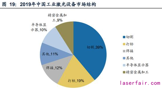 切割和焊接在工業(yè)激光設(shè)備中占比較大,重要性日益提升。激光切割、激光打標(biāo)和 激光焊接并稱(chēng)激光加工技術(shù)的三駕馬車(chē),是近年來(lái)激光在工業(yè)領(lǐng)域較為成熟和廣泛 的應(yīng)用,2019年在我國(guó)工業(yè)激光設(shè)備中的占比分別為39%、19%、12%,合計(jì)達(dá)70%。 激光打標(biāo)應(yīng)用最早,技術(shù)最成熟,近年來(lái)份額快速下滑,而切割與焊接則份額提升。 激光切割工作臺(tái)規(guī)格較少,具備相對(duì)標(biāo)準(zhǔn)的特征。激光焊接發(fā)展時(shí)間短,工藝難度 大于切割和打標(biāo),標(biāo)準(zhǔn)化程度低,自動(dòng)化設(shè)計(jì)難度大。