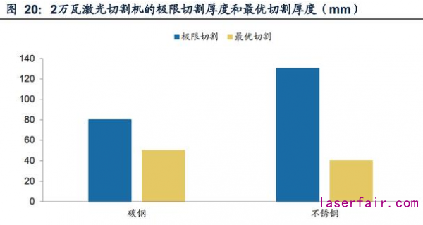 伴隨功率提高,設(shè)備的可切割厚度和效率齊升。據(jù)創(chuàng)鑫激光官網(wǎng),2萬(wàn)瓦激光切割機(jī) 將碳鋼和不銹鋼的最優(yōu)切割厚度分別突破至50mm和40mm。考慮到鋼板一般按厚度 分為薄板<4mm)、中板(4-20mm)、厚板(20-60mm)、特厚板(>60mm), 萬(wàn)瓦級(jí)設(shè)備已能完成對(duì)于中薄板和絕大部分厚板的切割工作,激光切割設(shè)備的應(yīng)用 場(chǎng)景不斷向中厚板領(lǐng)域延伸。除了提高切割材料厚度上限外,激光器高功率化還使 得切割效率不斷提升。例如在50mm碳鋼切割上,3萬(wàn)瓦激光切割機(jī)效率較2萬(wàn)瓦切割機(jī)效率可提高88%。