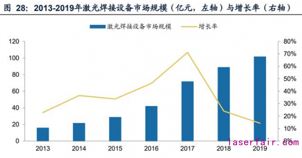 激光焊接設(shè)備在各細(xì)分領(lǐng)域滲透率提升,市場(chǎng)規(guī)模逐年攀升。2013-2018年,受益 于激光技術(shù)進(jìn)步和激光器價(jià)格下降,激光焊接設(shè)備在各行業(yè)滲透率不斷提高,疊加 下游新能源汽車(chē)、鋰電池、顯示面板,手機(jī)消費(fèi)電子等領(lǐng)域需求旺盛,國(guó)內(nèi)激光焊 接設(shè)備市場(chǎng)規(guī)??焖僭鲩L(zhǎng),年復(fù)合增長(zhǎng)率高達(dá)41.53%。2019年我國(guó)宏觀經(jīng)濟(jì)壓力加 大,受中美貿(mào)易摩擦、新能源汽車(chē)補(bǔ)貼退坡、消費(fèi)電子周期等影響,焊接設(shè)備市場(chǎng) 規(guī)模增速放緩。此次制造業(yè)處于上行周期,下游多個(gè)重要領(lǐng)域回暖,激光焊接市場(chǎng) 有望出現(xiàn)向上拐點(diǎn)。