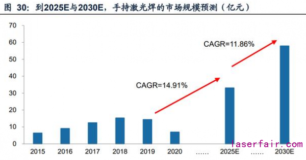 從測(cè)算結(jié)果看,到2025年,手持激光焊的市場(chǎng)規(guī)??梢赃_(dá)到33.06億元,2030年達(dá) 到57.91億元。2019至2025年,市場(chǎng)規(guī)模復(fù)合增速為14.91%;2025-2030年,增速 為11.86%。目前,手持激光焊所使用的激光器多在1-3kW,這一市場(chǎng)的增長(zhǎng)將為中 低功率激光器創(chuàng)造可觀的下游需求,銳科激光等國(guó)內(nèi)激光器企業(yè)可以在這一領(lǐng)域?qū)?現(xiàn)收入的快速提升。