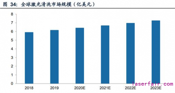 提高效率與性價(jià)比是開(kāi)拓激光清洗藍(lán)海市場(chǎng)的關(guān)鍵。據(jù)國(guó)際咨詢機(jī)構(gòu)Markets and markets數(shù)據(jù),2019年,全球工業(yè)清洗市場(chǎng)規(guī)模為468億美元。就激光清洗這一分支, Reportlinker數(shù)據(jù)顯示,2019年全球激光清洗市場(chǎng)規(guī)模為6.14億美元,到2023年這 一數(shù)值預(yù)計(jì)將達(dá)到7.24億美元。雖然激光清洗設(shè)備擁有市場(chǎng)規(guī)模不斷上升的前景, 但其當(dāng)前滲透率還極低,僅為1.31%。影響激光清洗普及的因素除了功率外,還有 設(shè)備的性價(jià)比。激光器的降價(jià)、激光清洗技術(shù)的日趨成熟,以及環(huán)保政策的鼓勵(lì)推 進(jìn),為激光清洗突破當(dāng)前技術(shù)與成本的局限創(chuàng)造了可能。