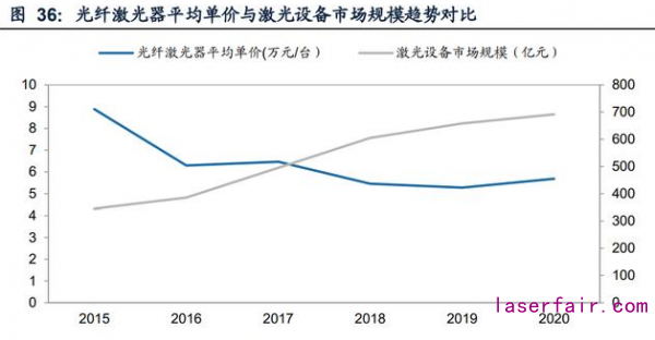 激光器價(jià)格下降,提高激光設(shè)備性價(jià)比,激光設(shè)備搶占傳統(tǒng)市場(chǎng)。對(duì)比2015-2020 年光纖激光器平均單價(jià)與激光設(shè)備市場(chǎng)規(guī)模趨勢(shì),發(fā)現(xiàn)二者呈現(xiàn)此消彼長(zhǎng)的關(guān)系, 即激光器價(jià)格下降,利于下游激光設(shè)備擴(kuò)大市場(chǎng)。2018年以來(lái),光纖激光器功率段 上移,但平均單價(jià)并無(wú)上漲趨勢(shì),表明高功率激光器降價(jià)幅度較大。