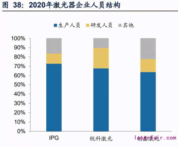 國(guó)內(nèi)企業(yè)在勞動(dòng)力成本和售后服務(wù)上更具優(yōu)勢(shì)。目前激光器的生產(chǎn)由于工藝復(fù)雜、步驟繁瑣,仍然主要依賴技術(shù)工人的組裝,因此激光器行業(yè)具有勞動(dòng)密集型屬性。 2020年IPG所有員工中制造人員占比達(dá)到75%,且主要來(lái)自于美國(guó)、俄羅斯、德國(guó) 等勞動(dòng)力成本較高的地區(qū),相比國(guó)內(nèi)企業(yè)而言在勞動(dòng)力成本方面具有一定劣勢(shì)。國(guó) 內(nèi)企業(yè)售后體系完善,響應(yīng)速度快。銳科基本形成了覆蓋全國(guó),輻射全球的服務(wù)體 系,并提出“8小時(shí)內(nèi)提出解決方案,48小時(shí)內(nèi)工程師現(xiàn)場(chǎng)維修”的承諾。
