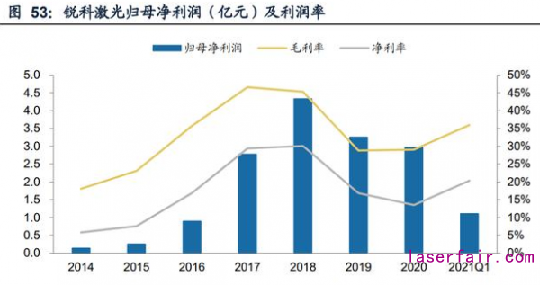 零部件自制比例高,隨市占率提升利潤(rùn)率有望重回高點(diǎn)。銳科激光通過(guò)自主研發(fā)和 垂直整合,實(shí)現(xiàn)關(guān)鍵零部件自產(chǎn),在2016-2018年實(shí)現(xiàn)了盈利能力的大幅提高,2018 年凈利率達(dá)到30%。受行業(yè)競(jìng)爭(zhēng)加劇影響,18H2以來(lái)激光器企業(yè)盈利能力普遍受到 影響,但公司通過(guò)工藝進(jìn)步、自制率提升,當(dāng)前利潤(rùn)率有探底回升的趨勢(shì)。