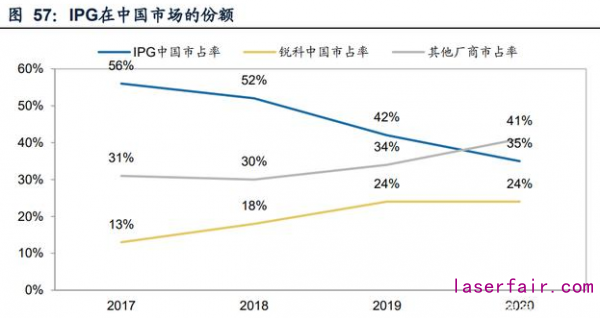 IPG由其董事長(zhǎng)兼首席執(zhí)行官Valentin Gapontsev博士于1990年創(chuàng)立的,2006年在 納斯達(dá)克上市,是全球第一家實(shí)現(xiàn)光纖激光器產(chǎn)業(yè)化的企業(yè)。2020年,IPG實(shí)現(xiàn)營(yíng) 業(yè)利潤(rùn)82.83億元,是全球最大的光纖激光器廠商。但近幾年受到國(guó)產(chǎn)廠商的沖擊, 其中國(guó)市占率持續(xù)下降。