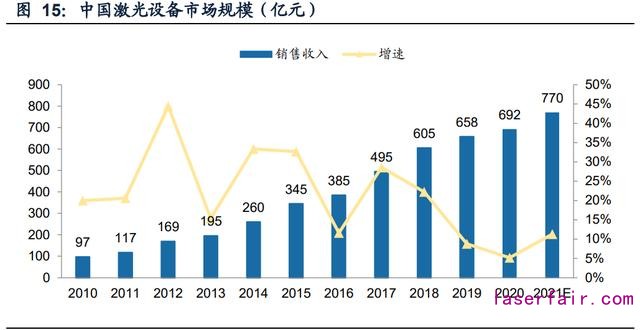 激光加工對傳統(tǒng)加工的加速替代,使得激光設(shè)備市場規(guī)模迅速擴大。激光加工作為 能夠在多領(lǐng)域替代傳統(tǒng)機械加工的新型加工技術(shù),在加工材料的材質(zhì)、形狀、尺寸 和加工環(huán)境等方面有著較大的自由度,能夠較好地解決不同材料的加工、成型和精 煉等技術(shù)問題,目前已經(jīng)在汽車、電子、航空航天、機械、冶金、鐵路、船舶等領(lǐng) 域越來越多地取代傳統(tǒng)制造技術(shù)。這一替代效應使得2010-2018年我國激光設(shè)備市 場經(jīng)歷了持續(xù)的高速增長,增速長期位于20%以上的高位,總銷售收入在2018年達 到605億元。2019年增速略有放緩,2020年達到692億元。