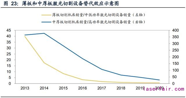 而在中厚板切割領(lǐng)域,高功率激光切割機的替代也在逐漸加速。2013年,每賣出365 臺中厚板傳統(tǒng)切削機床才能賣出1臺對應性能的激光切割機。2020年,高功率激光 切割機對中厚板切割市場的替代份額迅速上升至1/27。從迅速成長的替代份額看, 高功率激光切割機有望復制中低功率激光切割機在薄板切割中的擴張路徑,打開中 厚板切割的廣闊市場。