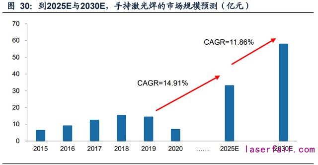 從測算結(jié)果看,到2025年,手持激光焊的市場規(guī)??梢赃_到33.06億元,2030年達 到57.91億元。2019至2025年,市場規(guī)模復合增速為14.91%;2025-2030年,增速 為11.86%。目前,手持激光焊所使用的激光器多在1-3kW,這一市場的增長將為中 低功率激光器創(chuàng)造可觀的下游需求,銳科激光等國內(nèi)激光器企業(yè)可以在這一領(lǐng)域?qū)?現(xiàn)收入的快速提升。