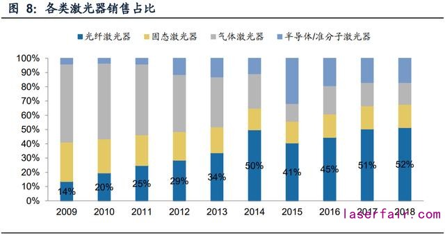 光纖激光器是目前的主流激光器。按照增益介質(zhì)的不同,激光器主要可以分為液體、 氣體、固體激光器,其中YAG固體激光器、CO2激光器先后占據(jù)主流。從90年代后 期開始,光纖激光器逐漸成為激光產(chǎn)業(yè)研究和應用的主流,在激光器市場銷售占比 從2009年的14%增長到2018年的52%。