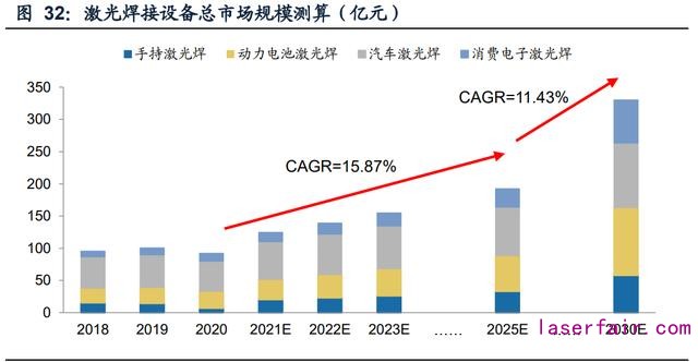 其中,2030年以前,激光焊接設(shè)備最大消費市場為汽車行業(yè),2030年變?yōu)閯恿﹄姵?行業(yè),二者為激光焊接設(shè)備創(chuàng)造的市場容量均超過100億元。2025年以前,市場增 長最快的是手持激光焊,2025年以后變?yōu)橄M電子激光焊。整體來看,高端制造領(lǐng) 域是激光焊的主戰(zhàn)場,其市場規(guī)模占比始終在80%以上,多采用高功率激光器,將 從需求端倒逼激光器的高功率化進程,為激光器行業(yè)發(fā)展提供龐大市場容量。