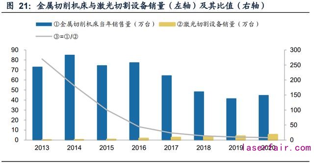 有效的性能替代和價格替代下,激光切割設(shè)備加速侵吞傳統(tǒng)切割市場。2013年我國 金屬切削機床銷量為72.90萬臺,同年激光切割設(shè)備剛剛起步,銷量僅有0.27萬臺。 6年間金屬切削機床銷量呈下跌趨勢,而激光切割設(shè)備則加速增長。到2020年,金 屬切削機床銷量降至44.60萬臺,激光切割設(shè)備銷量升至5.50萬臺。金屬切削機床銷 量對激光切割設(shè)備的比值從2013年的270迅速下滑至2020年的8。