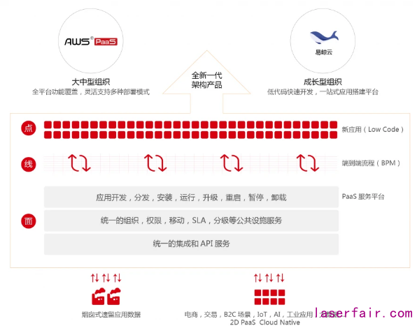 為了快速滿足組織在不同發(fā)展階段的業(yè)務(wù)訴求,AWS PaaS還提供了豐富的平臺產(chǎn)品矩陣,包括面向成長型組織的低代碼快速開發(fā),一站式應(yīng)用搭建平臺易鯨云產(chǎn)品;面向大中型組織的基于低代碼和BPM 為核心的AWS PaaS平臺;面向啟動云戰(zhàn)略的用戶提供四級安全隔離的多租戶PaaS云服務(wù)。