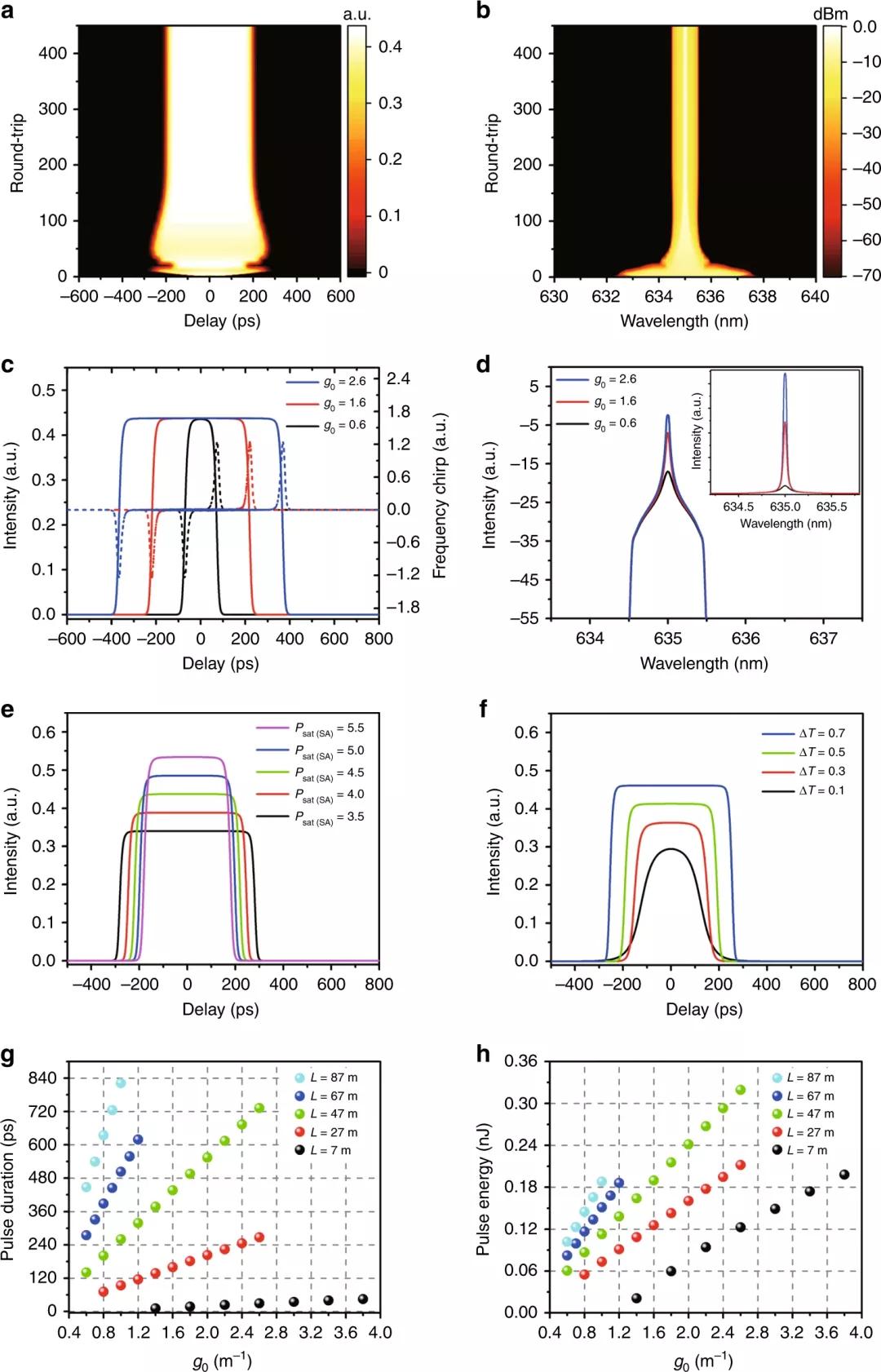 圖1 數(shù)值模擬結(jié)果:小信號增益系數(shù)為1.6m-1、調(diào)制深度為0.6、飽和功率為5.5 W、光纖環(huán)路長度為47 m。a、脈沖演化;b、最佳光譜演化;c、不同小信號增益系數(shù)下的脈沖時間輪廓(實線)和頻率啁啾(虛線);d、光譜(插圖:線性范圍內(nèi)的光譜);e、不同峰值功率下的脈沖時間分布。f、在不同調(diào)制深度下的脈沖時間分布;g、不同光纖環(huán)路長度下的脈沖持續(xù)時間;h、不同光纖環(huán)路長度下脈沖能量與小信號增益系數(shù)的關(guān)系。