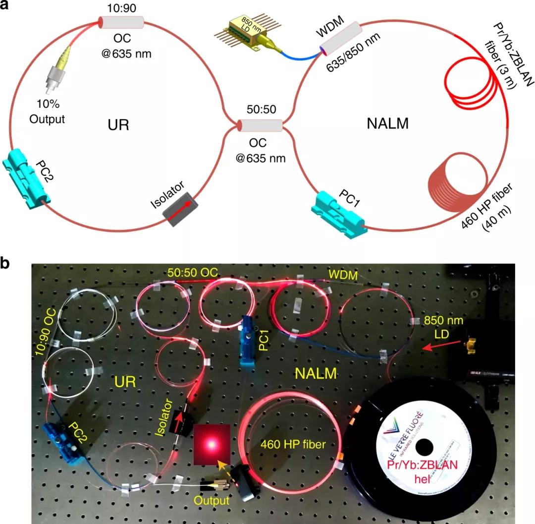 圖2 可見光被動鎖模光纖激光器的實驗裝置。a、裝置示意圖;b、635 nm耗散孤子共振鎖模光纖激光器的照片。