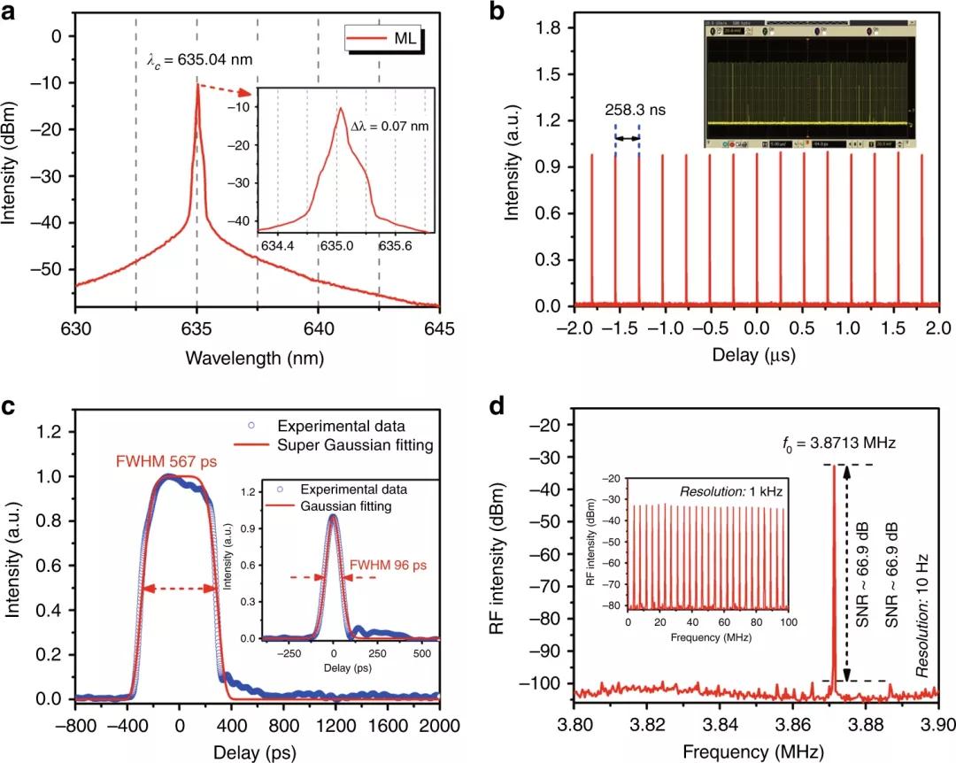 實驗中,連續(xù)波紅色激光的閾值是58 mW。當(dāng)泵浦功率超過68 mW時,研究人員觀察到穩(wěn)定的鎖模。泵浦功率為93 mW時,紅光鎖模脈沖的輸出特性,如圖3所示。可以看出,鎖模光譜的中心波長為635.04 nm,3-dB寬約為0.07 nm,在三角形基座輪廓上顯示出窄的光譜峰(類似于圖1d中的數(shù)值模擬)。圖3b給出了典型的脈沖序列,其間隔約為258.3 ns,與空腔往返時間(對應(yīng)于約53 m的空腔長度)匹配,輸出脈沖具有均勻的強度(圖3b的插圖),表明鎖模紅色激光器非常穩(wěn)定。圖3c展示了單脈沖包絡(luò),如果使用超高斯擬合,脈沖具有平頂矩形輪廓和567 ps脈沖持續(xù)時間。值得注意的是,在68 mW的泵浦功率下,研究人員觀察到最小脈沖持續(xù)時間為96 ps(圖3c插圖)。此外,如圖3d所示,以10 Hz分辨率帶寬記錄的輸出頻譜具有3.8713 MHz的基頻和66.9 dB的高信噪比。圖3的插圖顯示了100 MHz跨度的頻譜調(diào)制,進(jìn)一步表明了635 nm可見光光纖激光器的穩(wěn)定連續(xù)波鎖模運轉(zhuǎn)。
