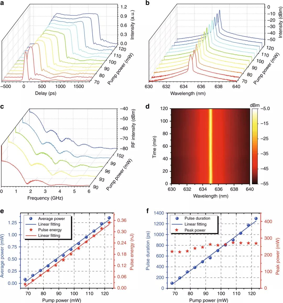 為了更好地理解635 nm鎖模運轉(zhuǎn),研究人員進(jìn)一步研究了紅色鎖模光纖激光器的典型輸出特性。圖4a顯示了單脈沖隨泵浦功率的變化。可以看到,隨著泵浦功率的增加,脈沖持續(xù)時間逐漸增加,呈現(xiàn)出典型的耗散孤子共振區(qū)域的特征。相應(yīng)的光譜在圖4b中給出并且三角形基座輪廓上的窄峰變得更強和更尖銳??梢钥吹?,圖4a,b中的實驗結(jié)果與圖1c,d中的數(shù)值結(jié)果非常一致,進(jìn)一步表明635 nm鎖模激光器工作在耗散孤子共振區(qū)。圖4c記錄了不同泵浦功率下寬范圍(6 GHz)的寬帶頻譜。在頻譜中,可以清楚地觀察到周期性調(diào)制包絡(luò)(與脈沖持續(xù)時間有關(guān))。隨著泵浦功率從90 mW增加到104 mW,射頻調(diào)制周期從~1.83 GHz減少到~1.20 GHz,脈沖持續(xù)時間相應(yīng)地從~550 ps增加到~830 ps(圖4a),這與耗散孤子共振理論一致。為了評估635 nm耗散孤子共振鎖模全光纖激光器的工作穩(wěn)定性,研究人員在93 mW的泵浦功率下,每10分鐘記錄一次光譜和頻譜。根據(jù)測量數(shù)據(jù),基頻處射頻強度的均方根值可估計為約0.209 dBm(僅對應(yīng)于約0.4%的相對射頻強度波動),這意味著脈沖運行穩(wěn)定。此外,如圖4d所示,激光輸出的中心波長沒有漂移,3-dB帶寬在2小時測試期間也沒有變化,這說明了極好的重復(fù)性和長期穩(wěn)定性。圖4e是平均輸出功率和脈沖能量與泵功率的函數(shù)關(guān)系。平均功率和脈沖能量線性增加,沒有任何飽和。實驗中,研究人員獲得了1.35 mW的最大輸出功率并且在122.9 mW的泵浦功率下,脈沖能量被計算為0.35 nJ。脈沖持續(xù)時間和峰值功率作為泵功率的函數(shù)繪制在圖4f中。隨著泵浦功率從68 mW增加到122.9 mW,脈沖持續(xù)時間從96 ps線性展寬到1298 ps而峰值功率最初略有增加,然后保持不變。