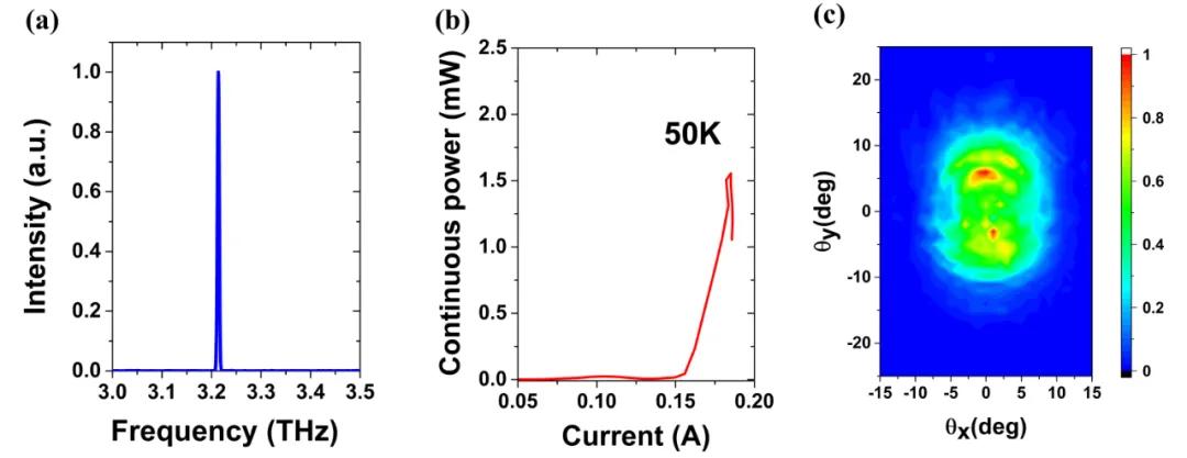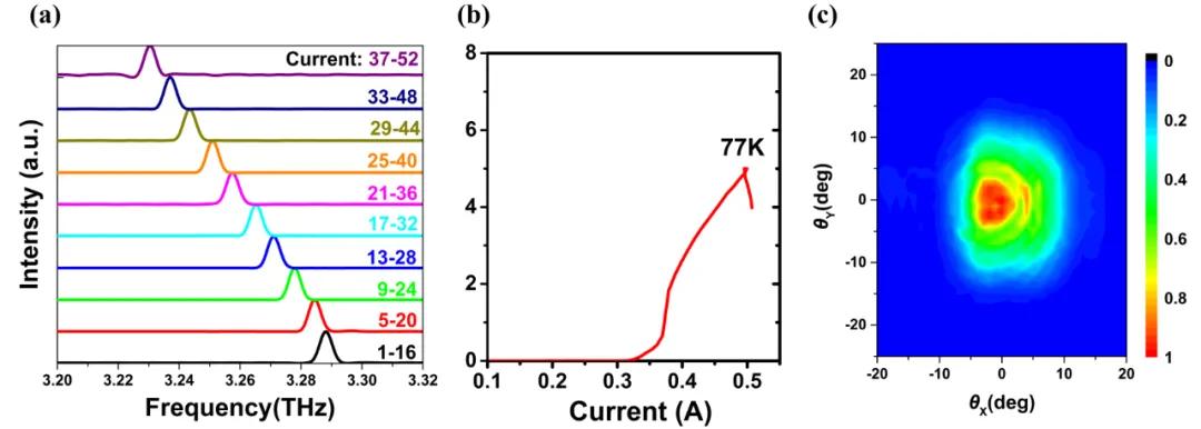 圖5:頻率連續(xù)調(diào)諧THz-QCL的典型測(cè)試結(jié)果。(a)單個(gè)器件頻率調(diào)諧范圍達(dá)到60GHz。(b)激光器在77K時(shí)的峰值功率為5mW。(c)光束遠(yuǎn)場(chǎng)分布圖。