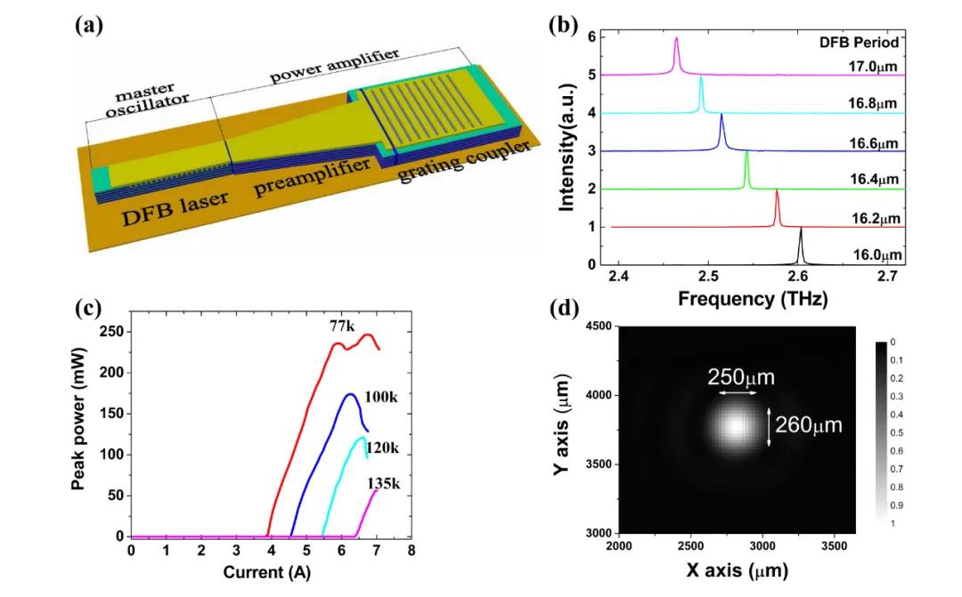 圖2:(a) THz-QCL激光器與放大器單片集成的原理圖。(b)一組共6個(gè)激光器的激光光譜圖。(c)-(d)典型器件的峰值功率和激光束斑。
