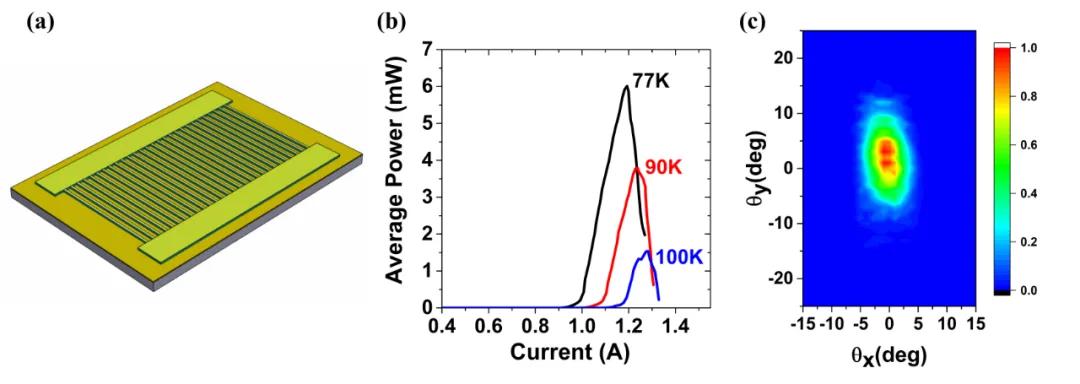圖3:(a)偶極天線陣列THz-QCL示意圖。(b)激光器在不同工作溫度時(shí)的平均輸出功率。(c)激光器的遠(yuǎn)場(chǎng)光束分布圖。