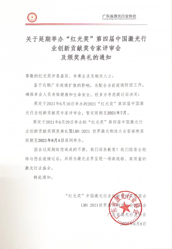 原定于2021年6月29日舉辦的“紅光獎”第四屆中國激光行業(yè)創(chuàng)新貢獻(xiàn)獎頒獎典禮暨LMN 2021 世界激光制造大會答謝晚宴延期至2021年8月4日深圳舉辦。