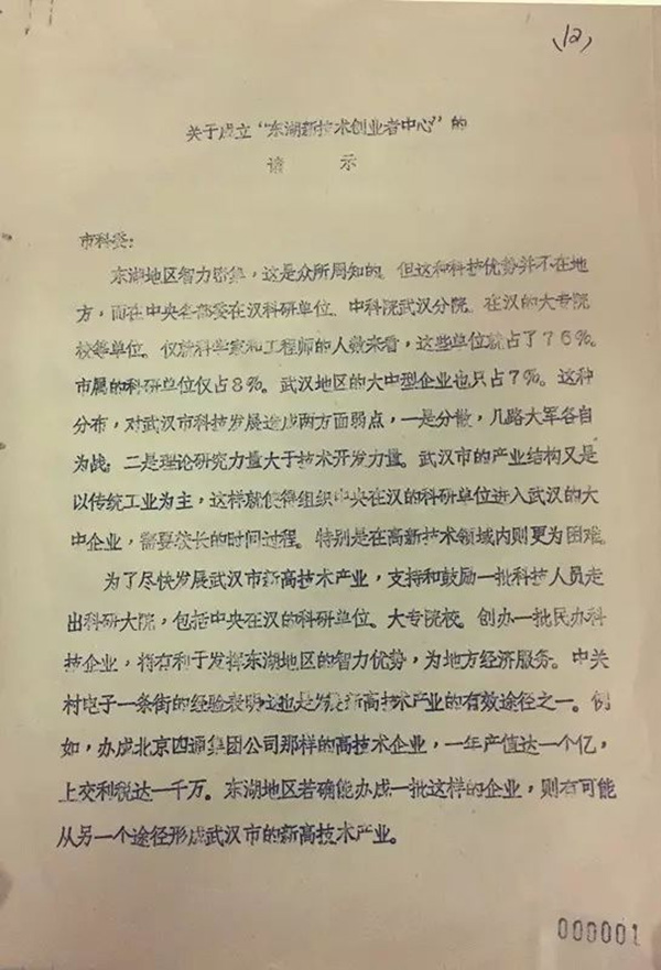 1987年,為了給科技創(chuàng)業(yè)撐起“保護(hù)傘”,尚在籌備階段的東湖新技術(shù)開發(fā)區(qū)向武漢市科委遞交了一份關(guān)于成立“東湖新技術(shù)創(chuàng)業(yè)者中心”的請(qǐng)示報(bào)告。
