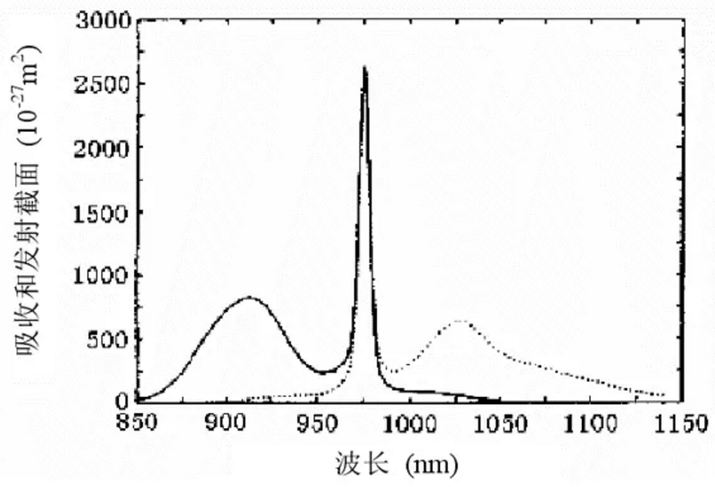 圖1:Yb光纖的吸收截面(實線)和發(fā)射截面(虛線)