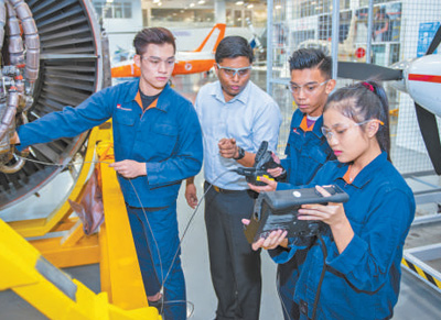 新加坡工藝教育學(xué)院的學(xué)生在航空引擎維修課上學(xué)習(xí)實操。