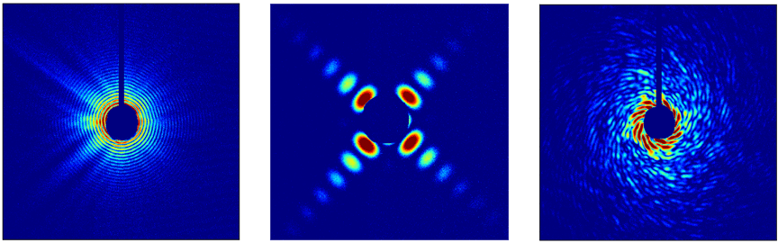 標(biāo)準(zhǔn)樣品圓孔、方孔及鸚鵡螺圖案的相干衍射圖樣。