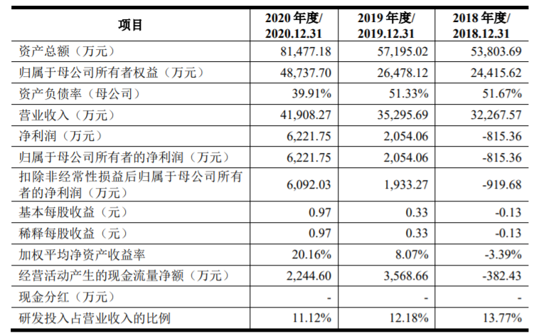 財務(wù)數(shù)據(jù)顯示,公司2018年、2019年、2020年營收分別為3.23億元、3.53億元、4.19億元;同期對應(yīng)的凈利潤分別為-815.36萬元、2,054.06萬元、6,221.75萬元。