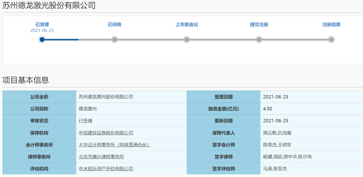 近日,資本邦了解到,蘇州德龍激光股份有限公司(下稱“德龍激光”)闖關(guān)科創(chuàng)板IPO獲上交所受理,本次擬募資4.5億元。