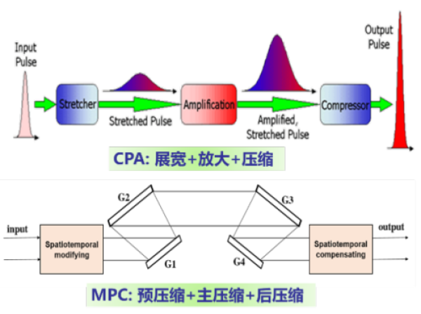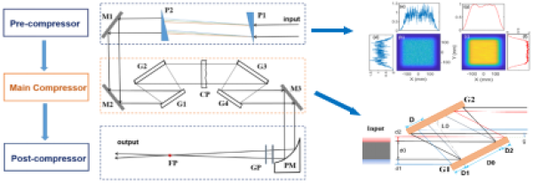 拍瓦(1015瓦,PW)超強(qiáng)激光在激光粒子加速乃至真空極化等前沿科學(xué)研究中有重要應(yīng)用。目前,獲得10s-100s PW超強(qiáng)激光的最大瓶頸是受限于壓縮光柵的尺寸與損傷閾值。2020年,科研人員利用光柵損傷閾值隨脈沖寬度增加而增加的特性,提出了“內(nèi)部分束壓縮器”[Optics Express 28(15):22978(2020)],降低了壓縮組束的難度。最近,科研人員基于前期研究,進(jìn)一步考慮激光時(shí)空特性,提出了“分步壓縮器(MPC)”的新設(shè)計(jì)。新的設(shè)計(jì)思想類似啁啾脈沖放大技術(shù)(CPA),CPA是將晶體損傷矛盾轉(zhuǎn)移到激光時(shí)域來(lái)解決,通過(guò)在放大前后分別增加展寬器與壓縮器專門解決脈沖的寬度問(wèn)題來(lái)實(shí)現(xiàn)。該MPC的新設(shè)計(jì)則是將壓縮光柵損傷的矛盾轉(zhuǎn)移到脈沖時(shí)空特性上,讓四光柵壓縮器的激光時(shí)空特性可實(shí)現(xiàn)最高能量的輸入輸出,并在前后增加預(yù)壓縮與后壓縮來(lái)專門解決時(shí)空特性問(wèn)題。