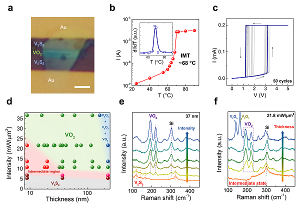 (a) V5S8-VO2-V5S8異質(zhì)結(jié)器件的光學(xué)照片;