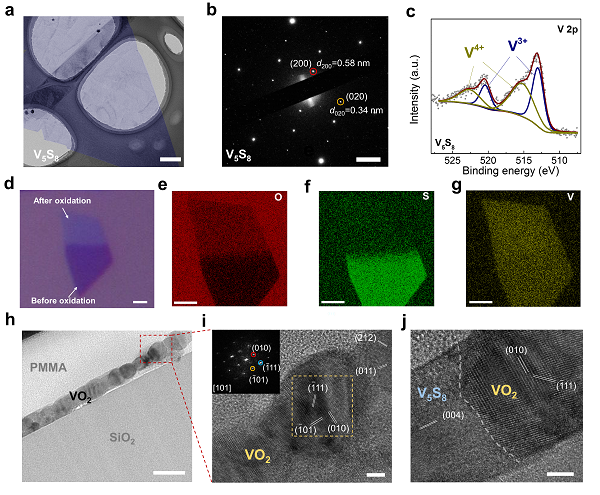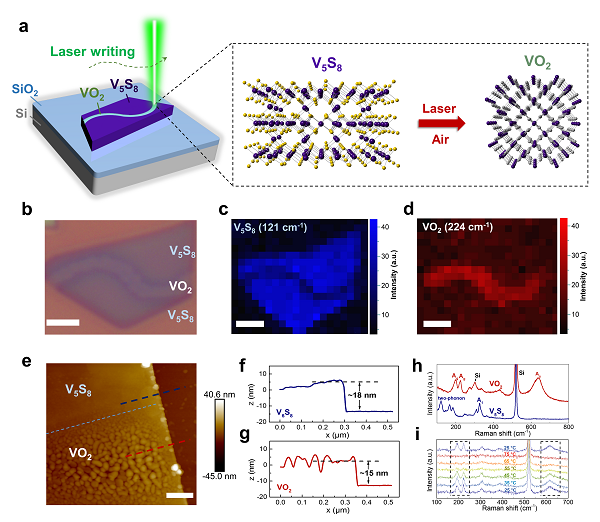 (a) 在大氣環(huán)境中激光直寫合成VO2的示意圖及V5S8和VO2的晶體結(jié)構(gòu)圖;