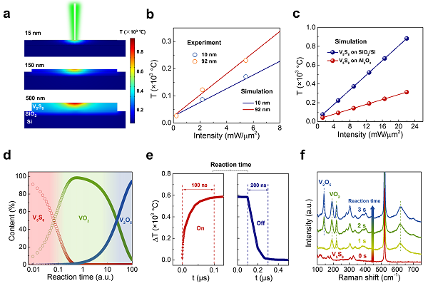 近日,清華大學(xué)材料學(xué)院劉鍇課題組利用激光按預(yù)設(shè)路徑局部輻照加熱氧化超薄硫化釩,便捷地在常壓大氣環(huán)境中實(shí)現(xiàn)了VO2的秒級圖案化合成,顯著區(qū)別于傳統(tǒng)VO2合成方法真空、長時(shí)間、全局加熱、圖案化工藝復(fù)雜的缺點(diǎn)。通過有限元模擬、反應(yīng)動(dòng)力學(xué)分析與實(shí)驗(yàn)研究,該工作證明了VO2的成功合成可以歸因于激光超快輻照下動(dòng)力學(xué)限制的合成機(jī)制和V5S8厚度依賴的光熱效應(yīng)。具體來說,V5S8的氧化是從低價(jià)到高價(jià)(V5S8→VSxOy→VO2→V3O7, V2O5)的分步過程。由于激光輻照可以實(shí)現(xiàn)百納秒級的數(shù)百攝氏度的超快升降溫,控制激光輻照時(shí)間便可以實(shí)現(xiàn)超短的化學(xué)反應(yīng)時(shí)間,從而得到了V5S8的亞穩(wěn)相氧化物VO2。在相同激光輻照時(shí)間下,樣品溫度會(huì)隨V5S8厚度和激光功率增大而升高,化學(xué)反應(yīng)速率加快從而得到高價(jià)態(tài)的釩氧化物。由此該工作在實(shí)驗(yàn)上得到了V5S8厚度和激光功率依賴的氧化產(chǎn)物相圖,從而實(shí)現(xiàn)了VO2的可控合成。