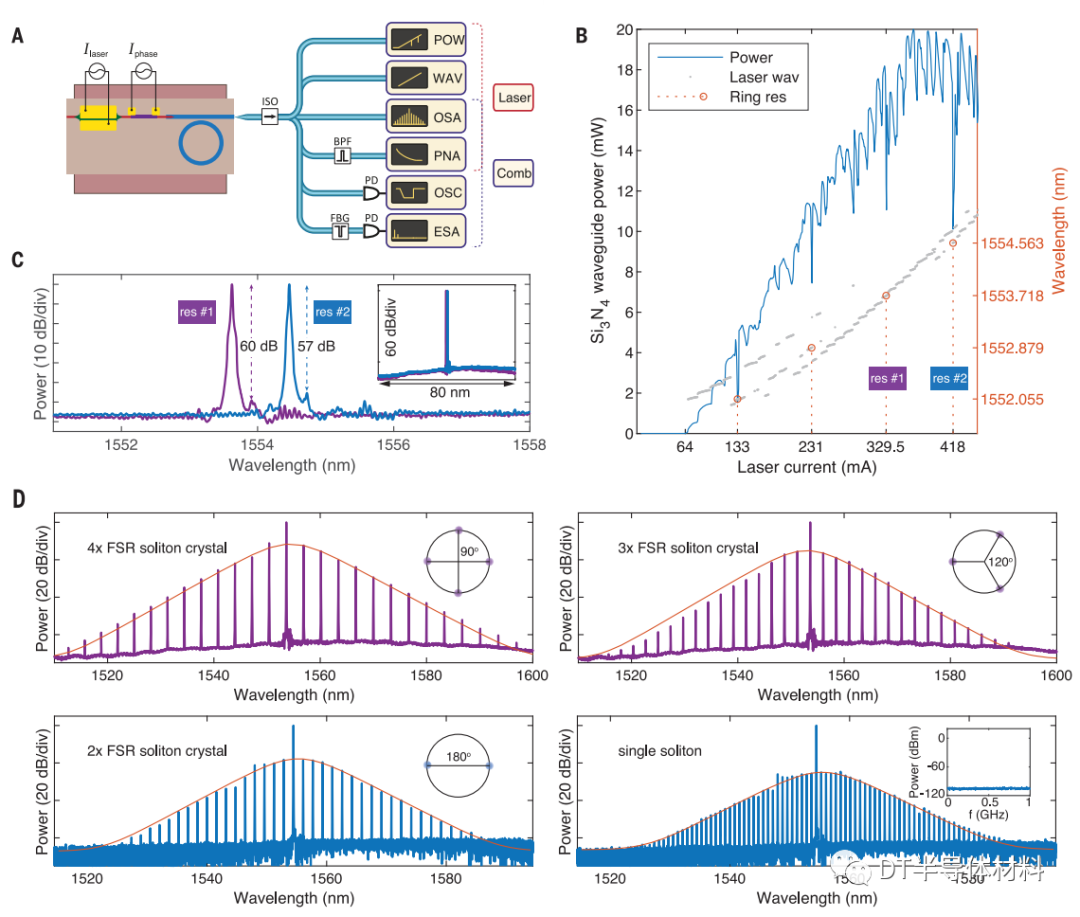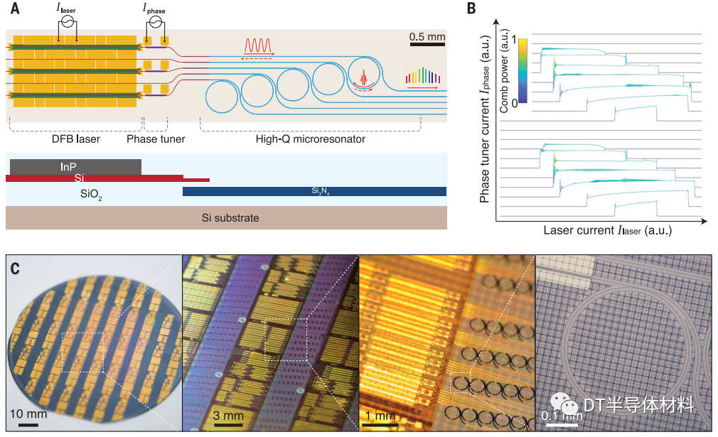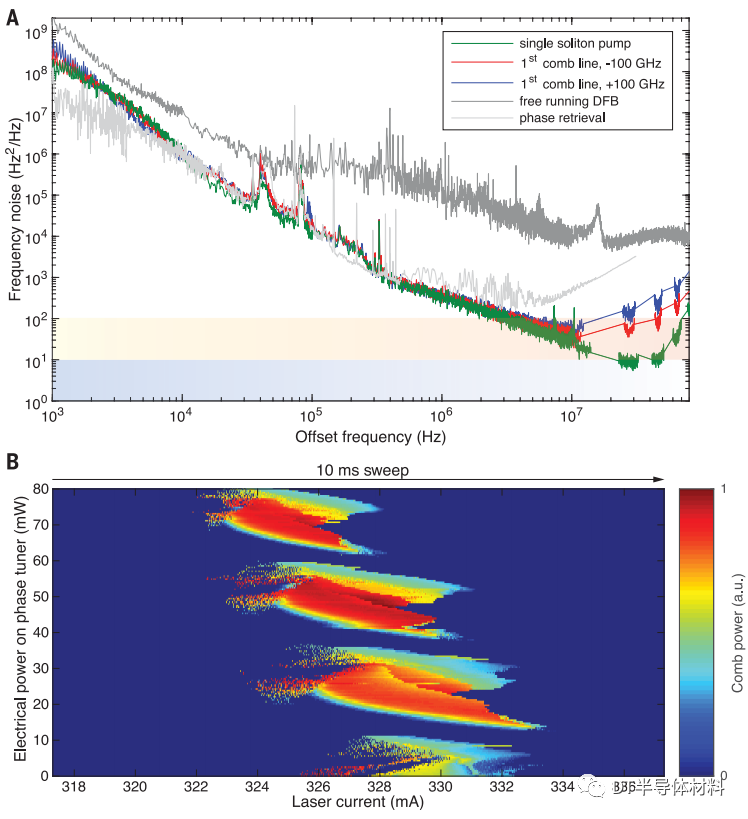 光孤子頻率梳的產(chǎn)生以及激光器噪聲的降低得益于 UCSB 高性能磷化銦 / 硅激光器以及 EPFL 采用光子大馬士革工藝制造的氮化硅超低損耗非線性諧振腔的優(yōu)越性能。