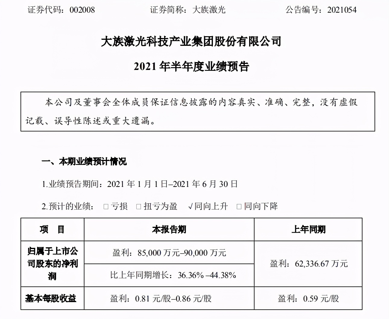 6月30日,大族激光披露了2021年半年度業(yè)績(jī)預(yù)告,預(yù)計(jì)歸屬于上市公司股東的凈利潤(rùn)盈利8.5億元至9億元,比上年同期增長(zhǎng)36.36%至44.38%,上年同期為6.23億元;基本每股收益0.81元/股至0.86元/股,上年同期為0.59元/股。