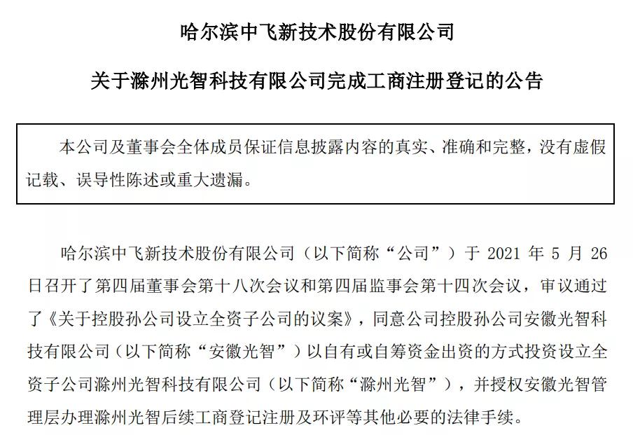 7月23日,中飛股份《關(guān)于滁州光智科技有限公司完成工商注冊登記的公告》,公告中提到,中飛股份控股孫公司安徽光智科技有限公司(以下簡稱“安徽光智”)投資設(shè)立的全資子公司滁州光智科技有限公司(以下簡稱“滁州光智”)近日已完成工商登記手續(xù),并取得了來安縣市場監(jiān)督管理局發(fā)放的營業(yè)執(zhí)照。