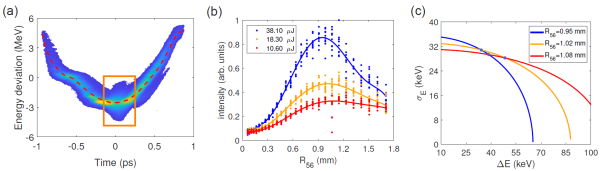 圖2 二極磁鐵中激光-束流相互作用的實驗表征。(a)與激光相互作用后電子束的縱向相空間,紅色虛線代表電子束的中心能量,橙色框中包含了因相互作用而改變的區(qū)域;(b)在不同的激光脈沖能量下,電子束通過第一個色散段后測量到的相干輻射強度及相應(yīng)的擬合曲線;(c)使用相干輻射產(chǎn)生方法來計算能量調(diào)制幅度及電子束團的切片能散