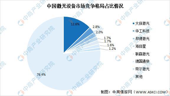 數(shù)據(jù)顯示,在我國(guó)激光設(shè)備市場(chǎng)競(jìng)爭(zhēng)格局中,大族激光、華工科技、邦德激光位居前三,占比分別為12.6%、2.8%、2.0%。海目星、聯(lián)贏激光、德國(guó)通快、帝爾激光市場(chǎng)占比較小,分別為1.7%、1.7%、1.6%、1.2%。