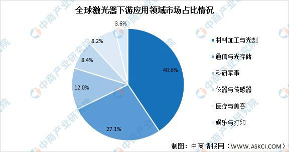 激光設(shè)備的應(yīng)用幾乎涵蓋所有工業(yè)領(lǐng)域,除輕工業(yè)、汽車、航空航天、動(dòng)力及能源行業(yè)外,正逐步向精細(xì)、微細(xì)加工領(lǐng)域拓展,有力推動(dòng)了電子制造、集成電路、通訊、機(jī)械、醫(yī)療、牙科、美容儀器設(shè)備及新興應(yīng)用的發(fā)展。除了應(yīng)用領(lǐng)域的不斷擴(kuò)張,激光技術(shù)在各領(lǐng)域的應(yīng)用范圍也逐漸由宏觀加工應(yīng)用覆蓋到更細(xì)微的工藝環(huán)節(jié)。數(shù)據(jù)顯示,激光器在材料加工與光刻市場(chǎng)占比最大,達(dá)40.6%。