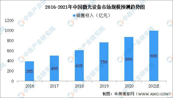 數(shù)據(jù)顯示,2018年中國(guó)激光設(shè)備市場(chǎng)規(guī)模達(dá)到605億元,同比增長(zhǎng)22.22%。2019年中國(guó)激光設(shè)備市場(chǎng)規(guī)模將超過750億元,增速繼續(xù)保持20%以上。預(yù)計(jì)2021年中國(guó)激光設(shè)備市場(chǎng)規(guī)模將達(dá)988億元。