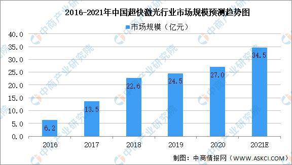 超快激光是固體激光器發(fā)展的一個(gè)新的領(lǐng)域,在進(jìn)行材料加工時(shí),會(huì)很大程度上避免長(zhǎng)脈寬、低強(qiáng)度的激光造成材料熔化與持續(xù)蒸發(fā)現(xiàn)象,可以大大提高加工質(zhì)量。數(shù)據(jù)顯示,2020年我國(guó)超快激光行業(yè)市場(chǎng)規(guī)模達(dá)到27億元,預(yù)計(jì)2021年我國(guó)超快激光行業(yè)市場(chǎng)規(guī)模可達(dá)34.5億元。