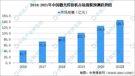 數(shù)據(jù)顯示,我國(guó)激光焊接機(jī)由2016年41.7億元增至2019年101.3億元,年均復(fù)合增長(zhǎng)率為34.4%。中商產(chǎn)業(yè)研究院預(yù)測(cè),2021年我國(guó)激光焊接機(jī)市場(chǎng)規(guī)??蛇_(dá)144.4億元。