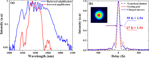實驗裝置如圖1所示,振蕩器及預(yù)放大后的小信號光先經(jīng)過偏振分束器及旋光器等器件后,以水平偏振注入棒狀光纖進行第一通放大,再由后面的旋光器和反射鏡返回并旋轉(zhuǎn)至豎直偏振后再次注入棒狀光纖進行第二通放大,預(yù)啁啾光柵對放置在兩通放大之間,雙通放大后的輸出光分為主輸出和次輸出,絕大部分激光從主輸出口輸出并被光柵對壓縮??蒲腥藛T將預(yù)啁啾管理放大技術(shù)與雙通放大技術(shù)相結(jié)合,利用雙通放大的高增益特性允許將振蕩器輸出的數(shù)十毫瓦弱小信號直接放大到百瓦量級的特點,簡化了實驗裝置,并通過優(yōu)化裝置參數(shù),在負啁啾下得到了兼具高平均功率和極短脈寬的結(jié)果。圖2藍色曲線是利用6片啁啾鏡得到的壓縮結(jié)果,對應(yīng)脈寬55fs, 平均功率100W。該研究成果揭示出雙通預(yù)啁啾管理放大系統(tǒng)中非線性相移量影響功率輸出的本質(zhì)特性,并提供了一種結(jié)構(gòu)緊湊、具有高增益的超快光纖激光系統(tǒng)建造方法。進一步結(jié)合分脈沖放大技術(shù),該方案有望成為高通量阿秒高次諧波驅(qū)動源的有效手段。