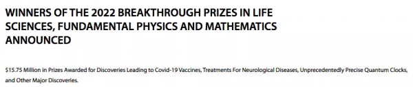 9月9日晚,新一屆美國(guó)科學(xué)突破獎(jiǎng)(Breakthrough Prize)公布,授予新冠疫苗、神經(jīng)疾病治療、量子鐘等領(lǐng)域的學(xué)者,他們共獲得1575萬(wàn)美元。其中,基礎(chǔ)物理學(xué)突破獎(jiǎng)授予東...